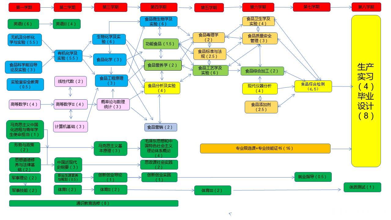 食品工程原理、食品工艺、食品化学、食品分析、现代仪器分析、食品卫生学、食品微生物学、食品毒理学、食品标准与法规、食品质量安全管理。