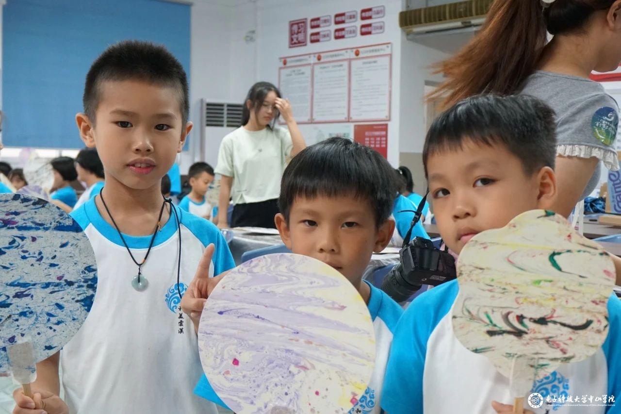 借助水的张力将大漆印刻于一把普通的扇子上,它便化身为承载着千年历史绝美东方色彩的非物质文化遗产艺术品——漆扇。在教学过程中,孩子们无不惊叹于这一神奇的变化。而当孩子们亲自动手,创造并触摸着自己创作的扇子,他们便能更深入地了解并感受到非遗文化的独特魅力。