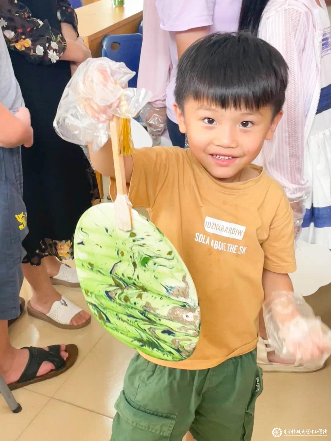 活动现场,学生志愿者们详细阐释了漆扇技艺的悠久历史与精湛技艺,并对调漆、稀释、配色、上色等关键步骤进行了细致入微的讲解与指导。儿童们以水为笔,以漆作画,在志愿者的引导下,将扇子轻轻浸入水中,旋转之间,漆液随着水流与外力交织,展现出清新素雅、浓墨重彩、大胆撞色等多元风貌,一幅幅精美的漆扇作品在微风中摇曳生姿,令人赞叹不已。