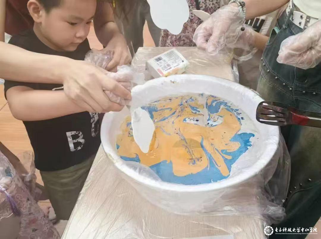 讲解结束后,小朋友们迫不及待地领取自己心怡形状的扇子,在学生团队的细心指导下,挥洒创意,以漆为笔,以水为画,创造出独一无二的工艺品,切身感受漆扇艺术所展现出不同色彩变化和艺术效果。