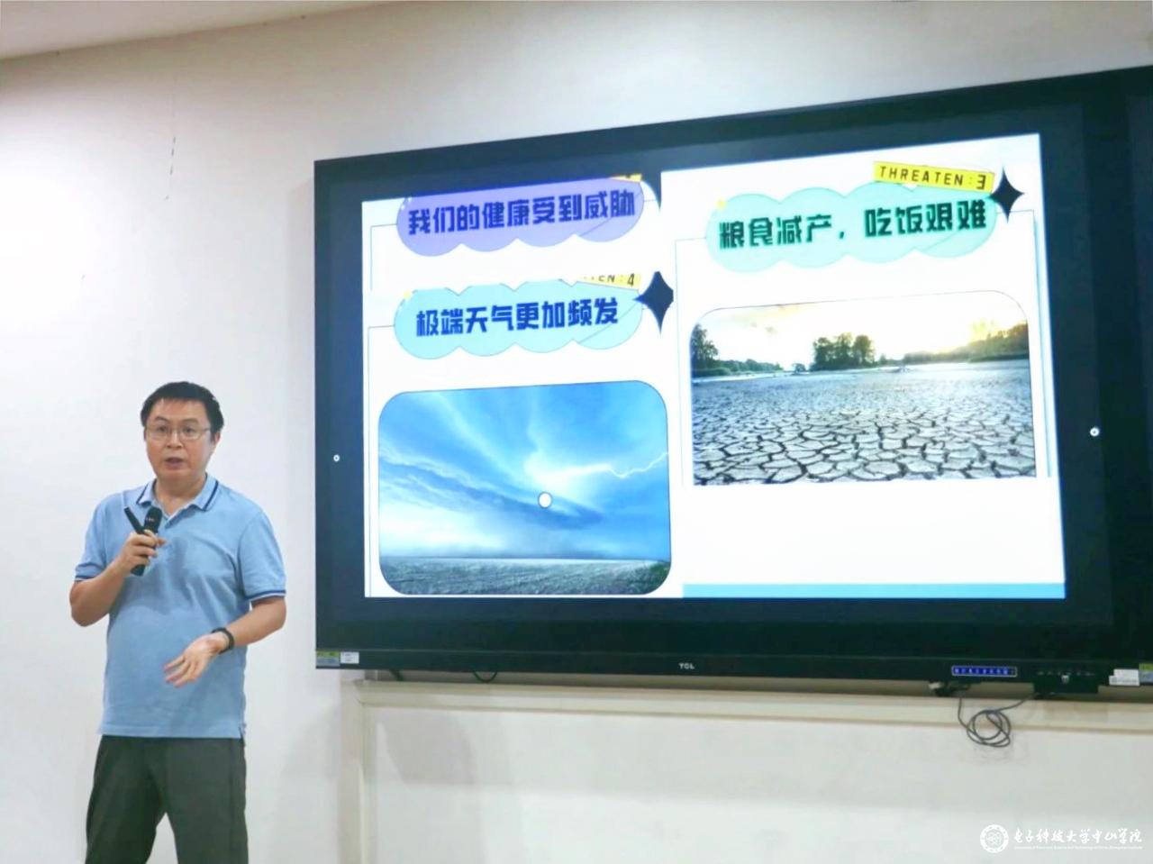 此外,蒋老师还鼓励在座的学生们增强自身的环保意识和责任感,从日常生活中的小事做起,积极践行减碳行动,并参与到维护绿色环保环境的公益活动中去。他呼吁大家成为环保理念的传播者和实践者,影响并带动周围的人一起加入到环保行列中来,共同努力构建一个绿色、可持续的未来。